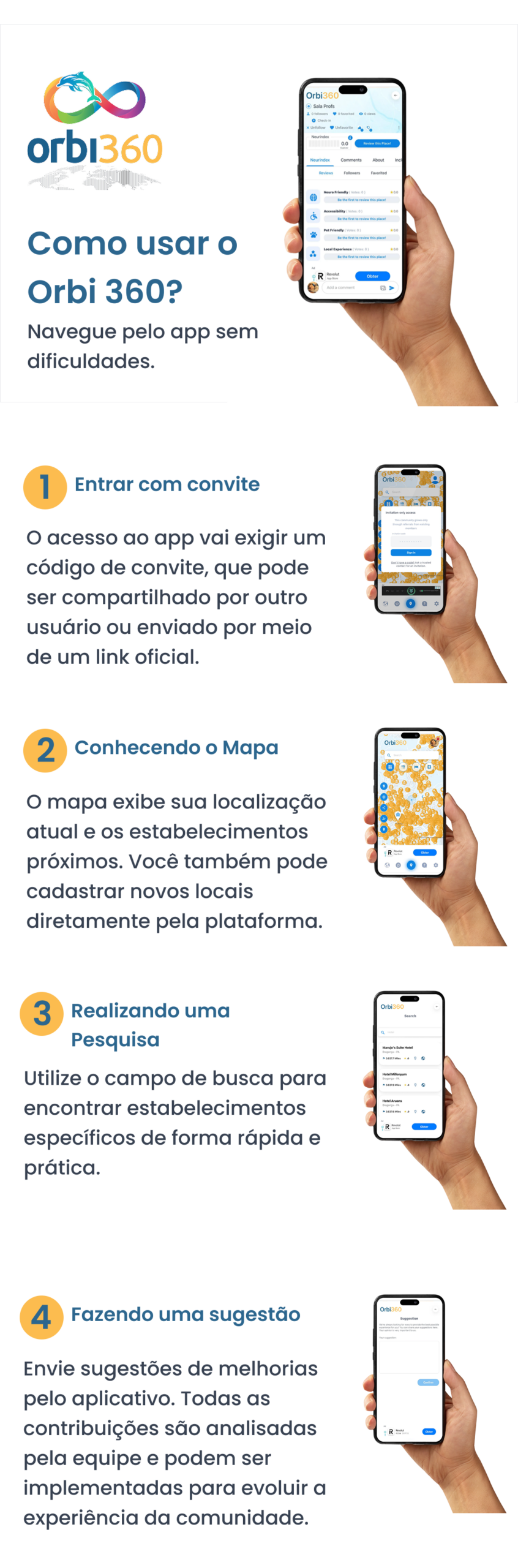Neste guia, mostramos como utilizar o mapa, pesquisar estabelecimentos e enviar sugestões que ajudam a fortalecer a comunidade. O Orbi360 conecta famílias a espaços mais inclusivos, promovendo acessibilidade e informação de forma prática.